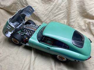 I built 50% of this kit over 15 years ago. Eventually, the box was too large to ignore. This is what I always wanted to do to my real E Type. This kits ’reputation’ didn’t disappoint: I see it as a vintage toy kit that always wanted to be a presentable model. For me, that required considerable effort and ‘re engineering’ to get close to the goal. In addition to the GTO style body cues, I re profiled the nose, added RC Brembo Front Brakes, Minilte Wheels, Tire Valves, and Five Point Belts. I widened the tires by sectioning tires from two kits, then scratch built the Bonnet Inner Panels, Intake Manifold, Rear Suspension Brake Lines, Diff Cooler, Coil Springs, Triple Webers, Intake Trumpets, Spark Plug Wires, Aluminum Exhaust Headers, Brake Booster, Throttle Linkage, Bonnet Intakes, Optima Battery, added Resin Spark Plugs and Fluorescent styrene rods for headlight bulbs. As a ‘Track Day’ weekend racer, I deleted the bumpers, front turn signals, wipers, added a low pressure exhaust and cut pressure vents in the rear window. The paint is Tamiya TS60 Pearl Green with Mr. Hobby Clear. The only adhesive that worked reliably on this ancient plastic was E6000 along with many brass pins and magnets to add strength.